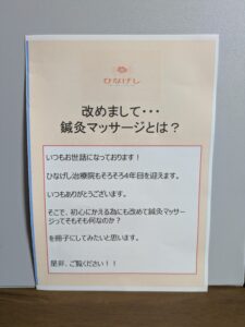 ひなげし治療院は朝霞市・和光市・志木市・新座市全域に訪問可能な訪問鍼灸マッサージの事業所です。医療保険での施術が可能。自費施術にも力を入れています。神経痛・リウマチ・腰痛・五十肩・関節拘縮・膝痛など・・・ さまざまなお悩みのある方への施術が可能です。